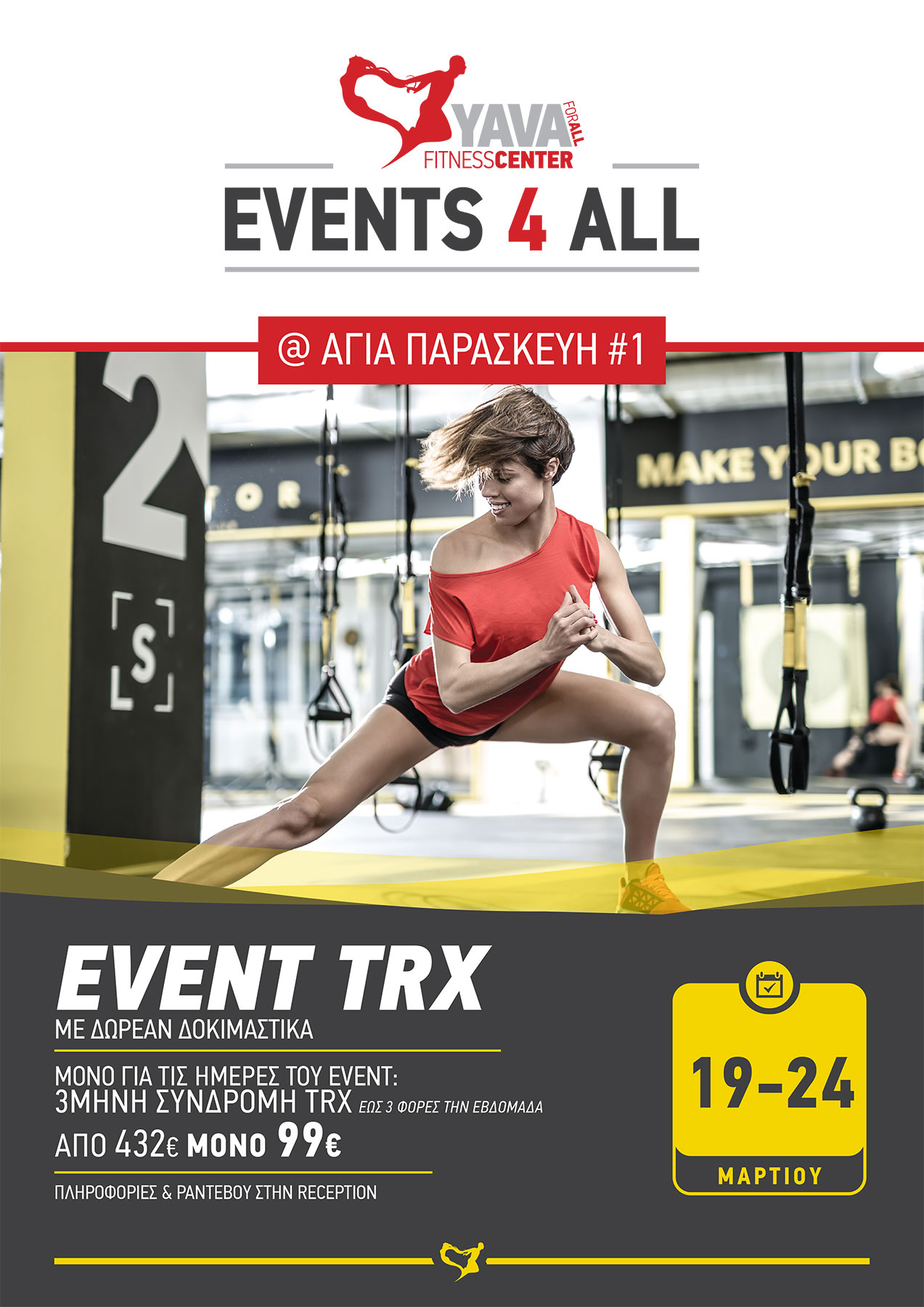 Τα YAVA Αγ. Παρασκευής #1 παρουσιάζουν (ξανά) το TRX! Έλα από 19 έως 24/03 και κάνε TRX εντελώς δωρεάν! Ανακάλυψε έναν μοναδικό τρόπο γυμναστικής και επωφελήσου από την προσφορά της 3μηνης συνδρομής TRX (έως 3 φορές την εβδομάδα) από 342 ευρώ, τώρα μόνο 99 ευρώ! Μάθε περισσότερα...
