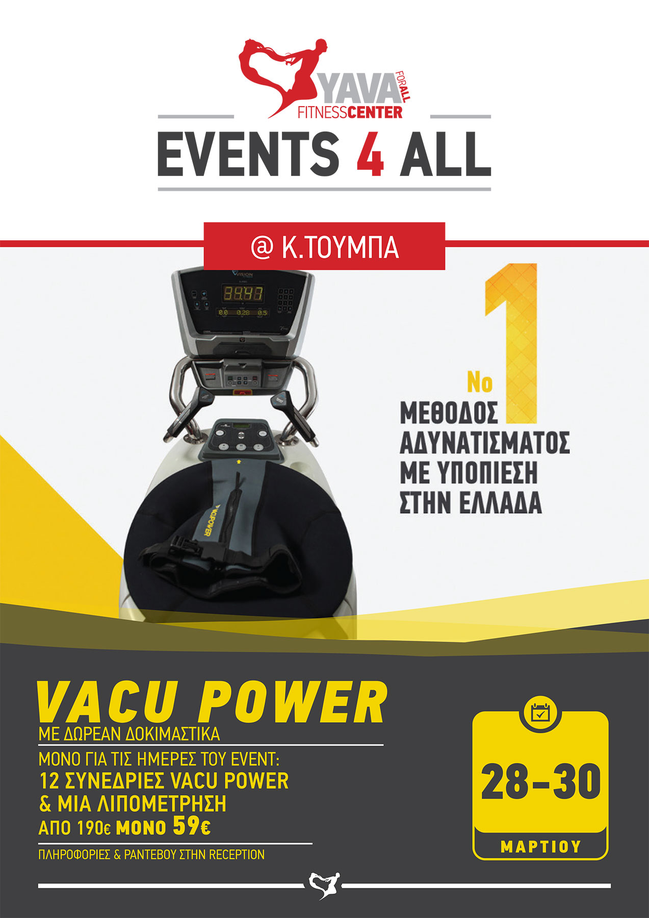 Άλλαξε το σώμα σου στα YAVA Κάτω Τούμπας! Έλα από τις 28 έως τις 30/03 δοκίμασε την μέθοδο αδυνατίσματος με υποπίεση Vacu Power και απόκτησε 12 συνεδρίες και μία λιπομέτρηση, από 190 ευρώ μόνο 59 ευρώ! Μάθε περισσότερα στη reception του γυμναστηρίου!   #Yava – It’s not fitness, it’s life!      ...