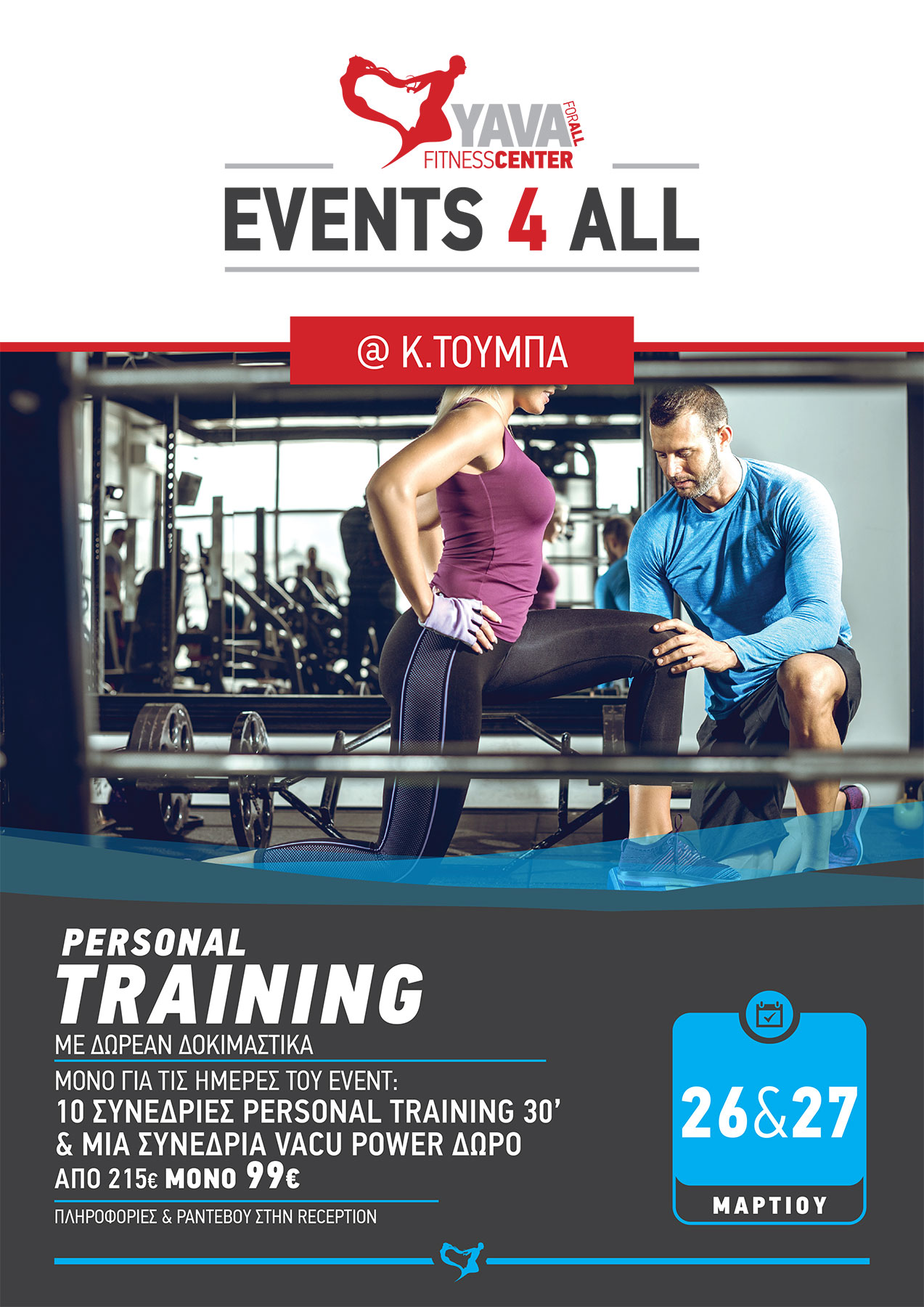 Ανακάλυψε τα πάντα για το Personal Training στα YAVA Κάτω Τούμπας! Έλα στις 26 & 27/03, δοκίμασε την εμπειρία του Personal Training και επωφελήσου από τη μοναδική προσφορά! 10συνεδρίες Personal Training (30’) από 215, τώρα 99 ευρώ και δώρο μία συνεδρία Vacu Power! Μάθε περισσότερα στη reception...