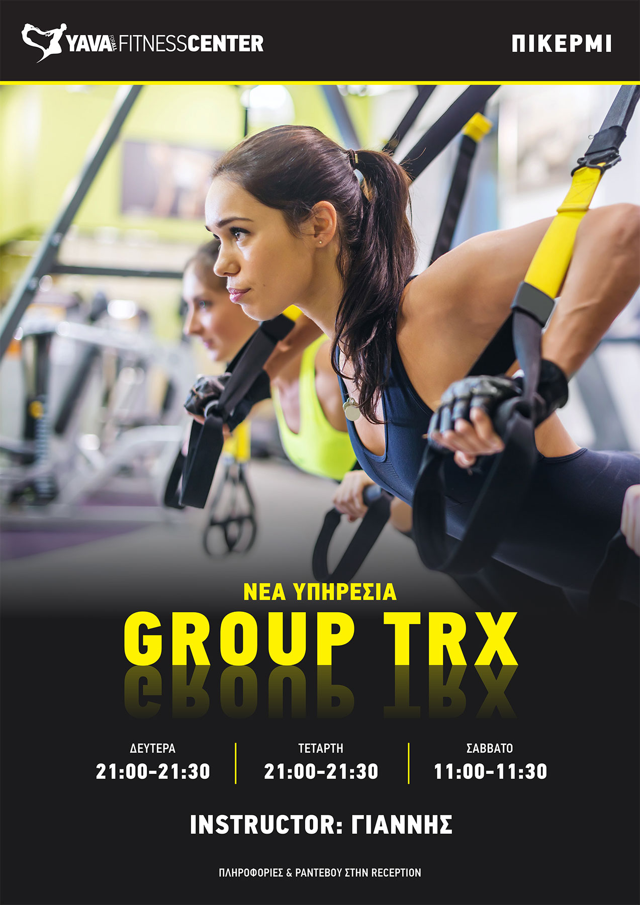 Ανακάλυψε το TRX στα YAVA στο Πικέρμι! Τώρα μπορείς να αποκτήσεις τη μοναδική, έντονη εμπειρία του πρωτοποριακού TRX, στις ομαδικές προπονήσεις, με instructor τον Γιάννη, από Δευτέρα έως Τετάρτη στις 21:00-21:30 και το Σάββατο στις 11:00-11:30. Μάθε περισσότερα στη reception του γυμναστηρίου! #Yava – It’s not fitness, it’s life!      ...