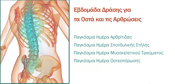 Η Εβδομάδας Δράσης για τα Οστά και τις Αρθρώσεις ξεκινά στις 12 Οκτωβρίου με την Παγκόσμια Ημέρα Αρθρίτιδας, συνεχίζεται με την Παγκόσμια Ημέρα Σπονδυλικής Στήλης στις 16 Οκτωβρίου, με την Παγκόσμια Ημέρα Τραύματος στις 17 Οκτωβρίου και ολοκληρώνεται στις 20 Οκτωβρίου με την Παγκόσμια Ημέρα...