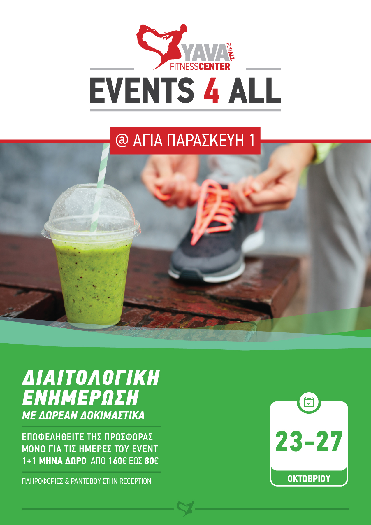 Η σωστή και τακτική άσκηση είναι το ένα σκέλος για μια ζωή γεμάτη υγεία και ευεξία. Το άλλο είναι η σωστή διατροφή, ένα πράγμα που συχνά παραμελείται απ' όσους κάνουν τακτικά γυμναστική. Για 5 ολόκληρες ημέρες, από τις 23 μέχρι τις 27 Οκτωβρίου, σας περιμένουμε στα YAVA Αγιας...