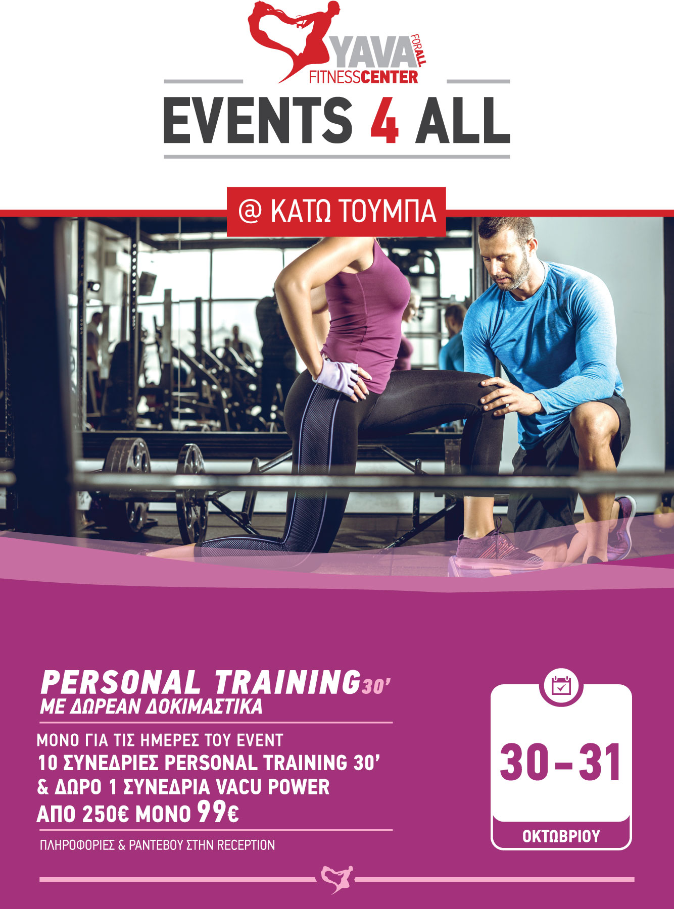 Eάν δεν διαθέτετε πολύ χρόνο ή χρειάζεστε μία εξτρά παρακίνηση για να γυμναστείτε, τότε το Personal Training είναι αυτό ακριβώς που χρειάζεστε για τις προπονήσεις σας.  Σας περιμένουμε, στις 30 και 31 Οκτωβρίου, στο YAVA Κάτω Τούμπας για δωρεάν δοκιμαστικά personal training, διάρκειας 30' για κάθε συνεδρία....