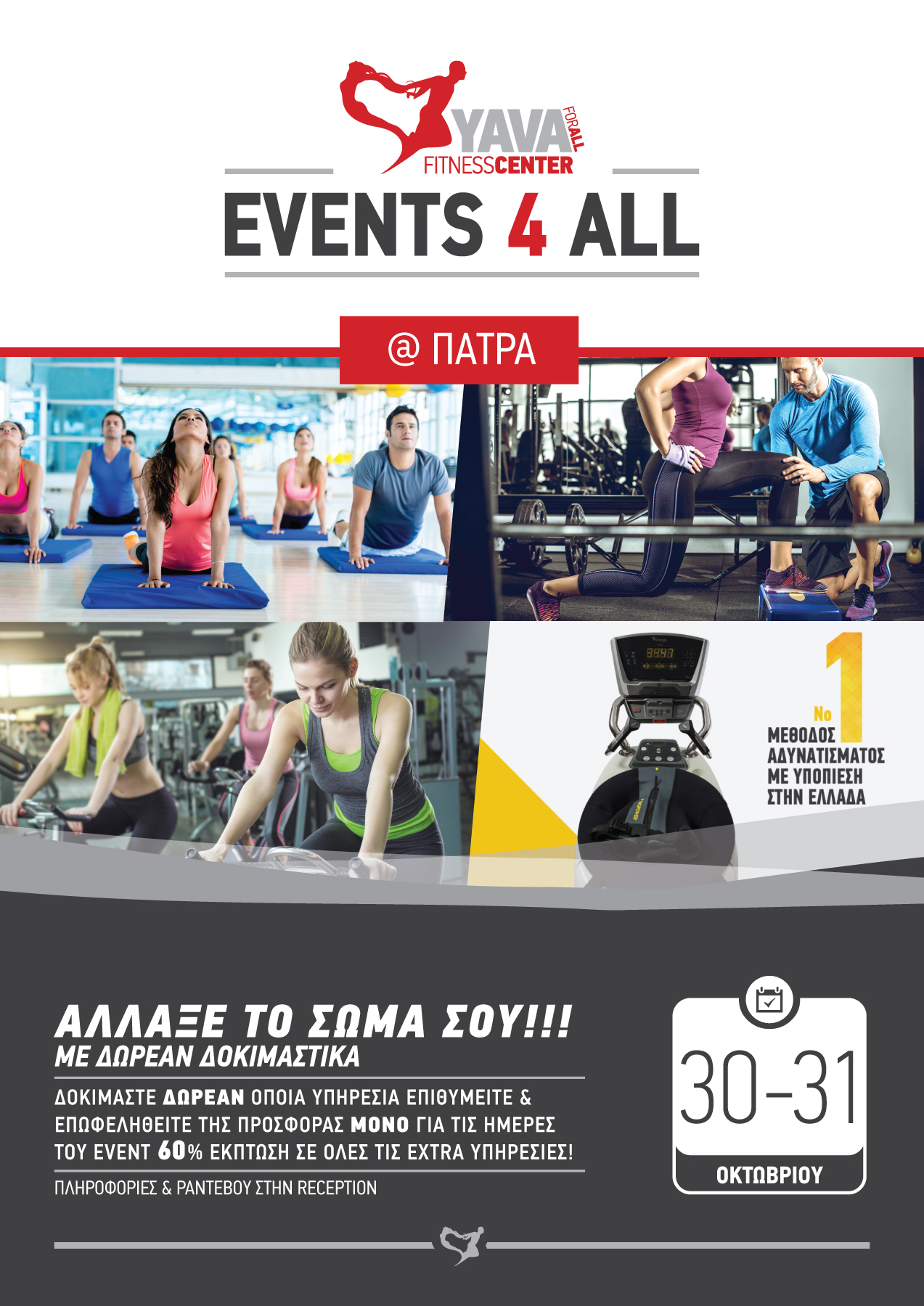 Στις 30 και 31 Οκτωβρίου κάντε το πρώτο βήμα για να αλλάξετε το σώμα σας! Σας περιμένουμε στο YAVA Πάτρας, για να δοκιμάσετε ΔΩΡΕΑΝ όποια υπηρεσία επιθυμείτε. Επίσης, και μόνο για τις ημέρες του event, μπορείτε να επωφεληθείτε της έκπτωσης 60% για όλες τις extra υπηρεσίες! Σας περιμένουμε,...